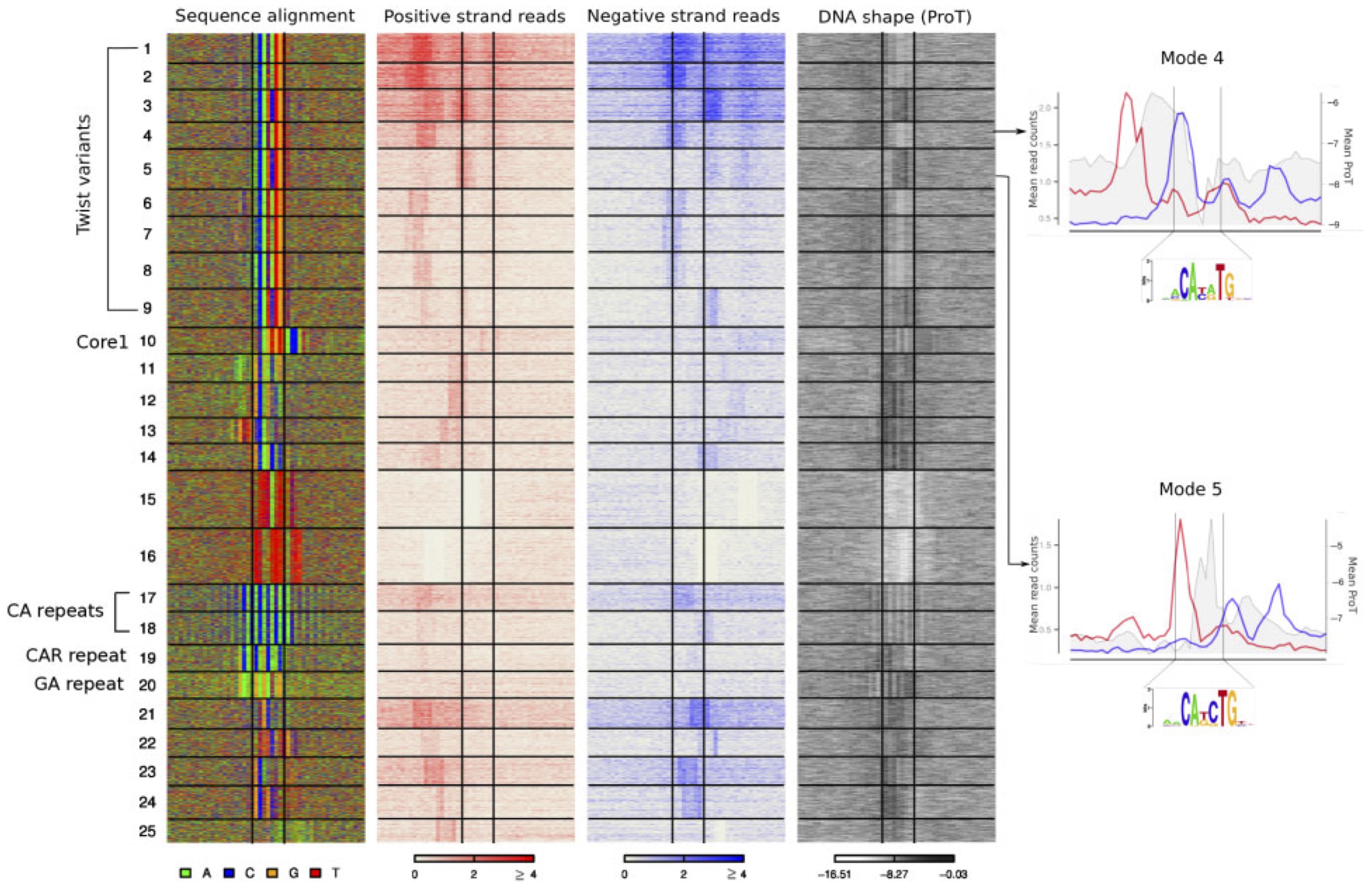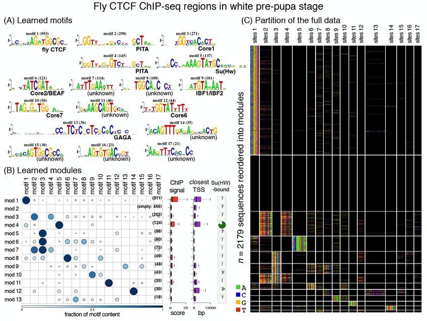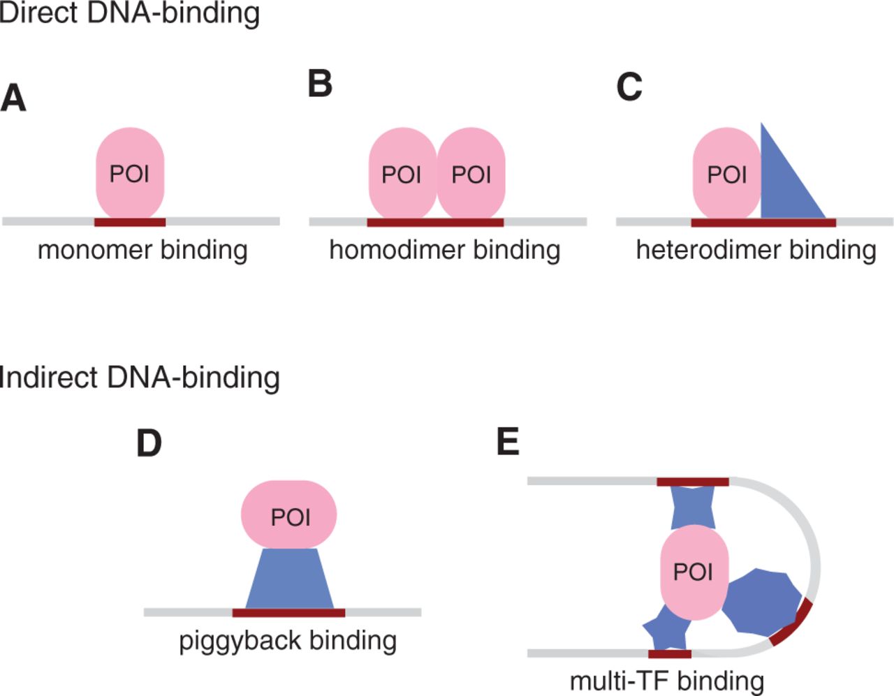 In chromatin immunoprecipitation-based high throughput experiments the protein binding to the DNA directly at its recognition site is not the only way the protein can cause the region to immunoprecipitate. Its binding specificity can change through association with different co-factors, it can bind DNA indirectly, through intermediaries, or even enforce its function through long-range chromosomal interactions. We present a novel Bayesian method that identifies distinct protein-DNA binding mechanisms without relying on any motif database.