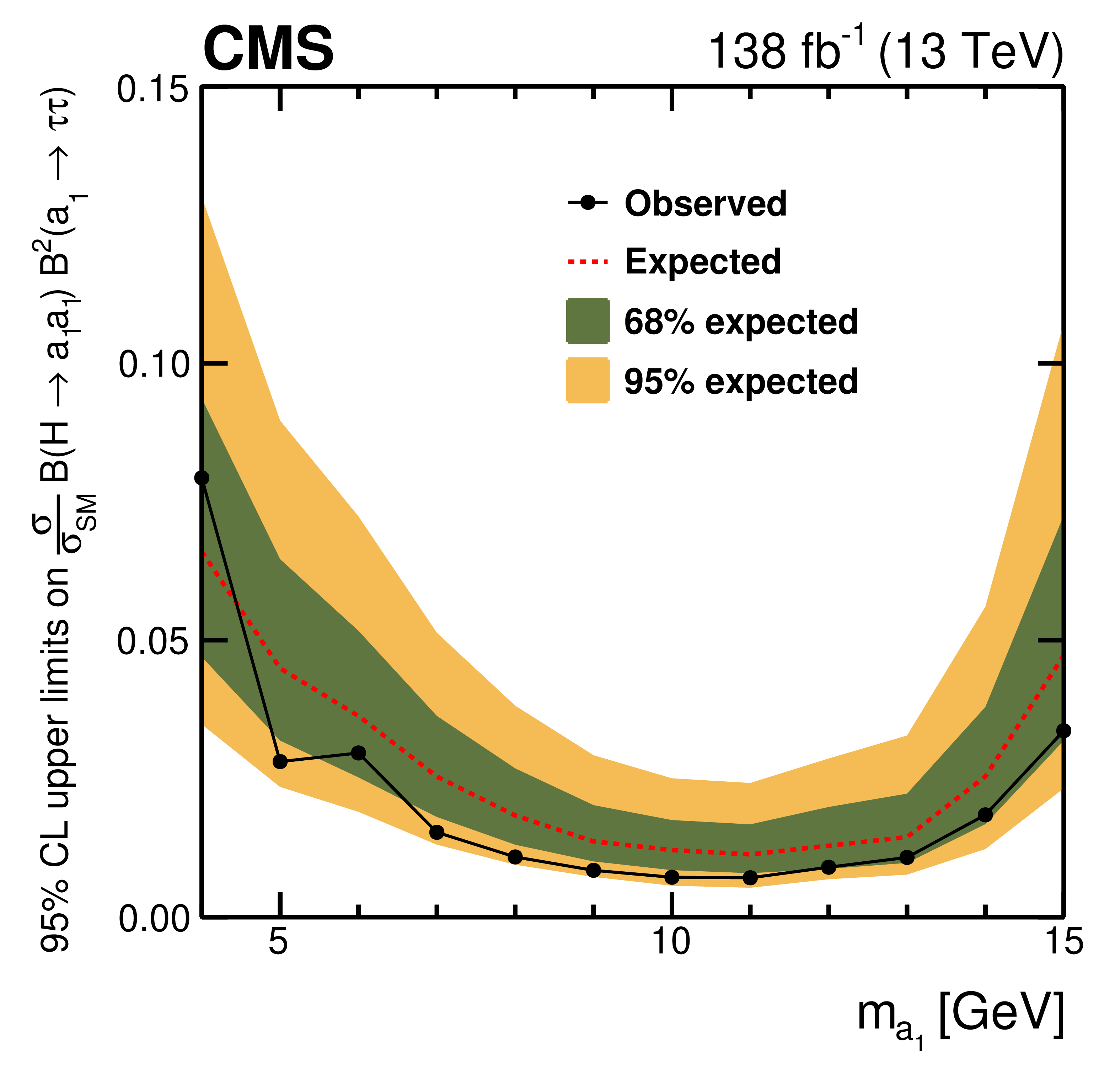 A search for a pair of light pseudoscalar bosons (a1) produced in the decay of the 125 GeV Higgs boson is presented. The analysis examines decay modes where one a1 decays into a pair of tau leptons and the other decays into either another pair of tau leptons or a pair of muons. The a1 boson mass probed in this study ranges from 4 to 15 GeV. The data sample was recorded by the CMS experiment in proton-proton collisions at a center-of-mass energy of 13 TeV and corresponds to an integrated luminosity of 138 fb−1. No excess above standard model (SM) expectations is observed. The study combines the 4τ and 2μ2τ channels to set upper limits at 95% confidence level (CL) on the product of the Higgs boson production cross section and the branching fraction to the 4τ final state, relative to the Higgs boson production cross section predicted by the SM. In this interpretation, the a1 boson is assumed to have Yukawa-like couplings to fermions, with coupling strengths proportional to the respective fermion masses. The observed (expected) upper limits range between 0.007 (0.011) and 0.079 (0.066) across the mass range considered. The results are also interpreted in the context of models with two Higgs doublets and an additional complex singlet field (2HD+S). The tightest constraints are obtained for the Type III 2HD+S model. In this case, assuming the Higgs boson production cross section equals the SM prediction, values of the branching ratio for the Higgs boson decay into a pair of a1 bosons exceeding 16% are excluded at 95% CL for a1 boson masses between 5 and 15 GeV and tanβ> 2, with the exception of scenarios in which the a1 boson mixes with charm or bottom quark-antiquark bound states.
