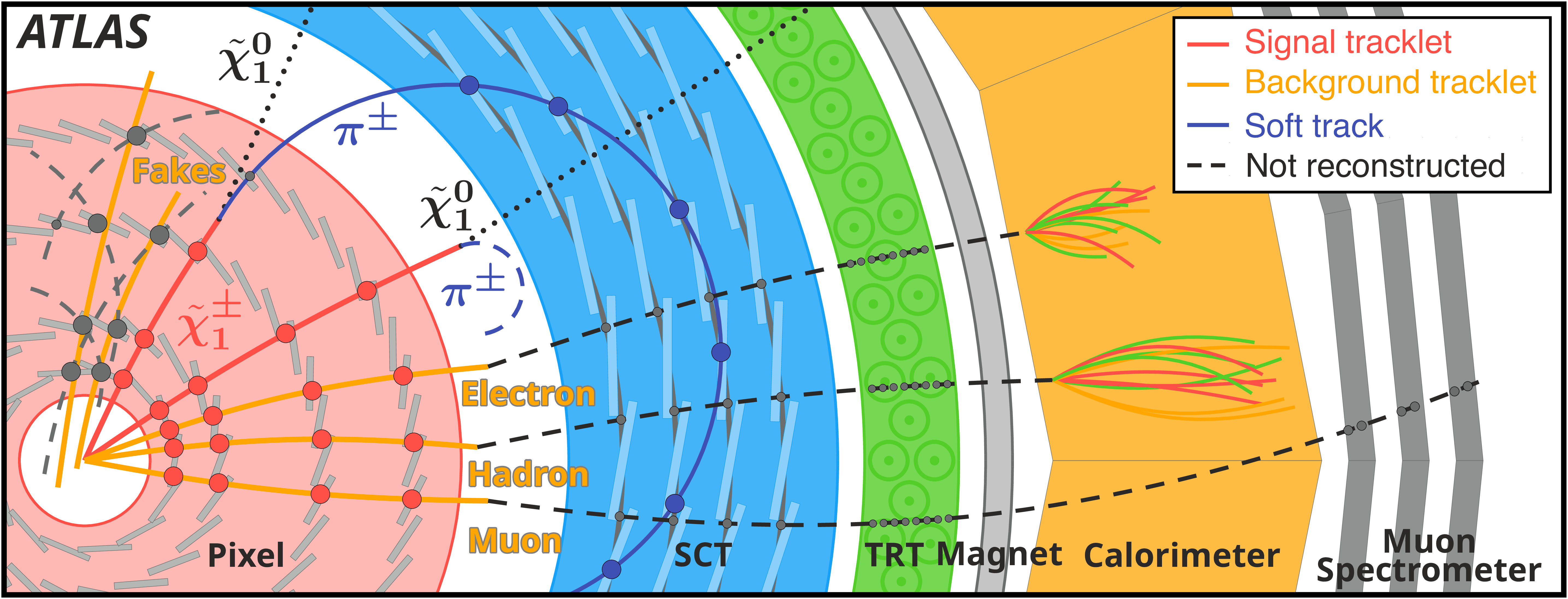A pictorial representation of signal and background processes. Detectors are not to scale and for illustration purposes only. The signal chargino (χ1±) decays into a charged pion (π±) and neutralino (χ10). ‘Fake’, ‘Muon’ and ‘Electron or hadron’ in the figure represent the fake-tracklet background, the muon background and electron or hadron backgrounds respectively.